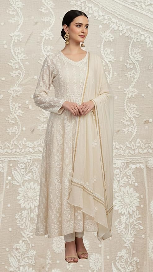 Semi Stitched 3 Piece Chikankari Suit Set: This set includes semi-stitched Anarkali, bottom & dupatta fabric with fine handcrafted Chikankari embroidery on graceful silhouette.