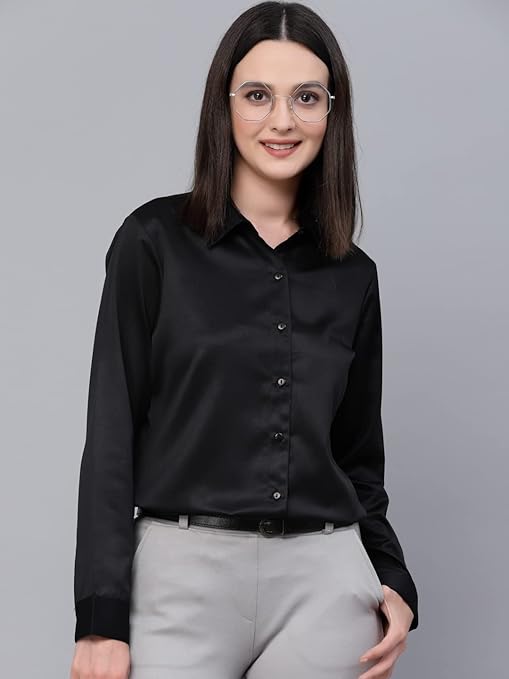 Style Quotient Women Solid Black Satin Formal Shirt
