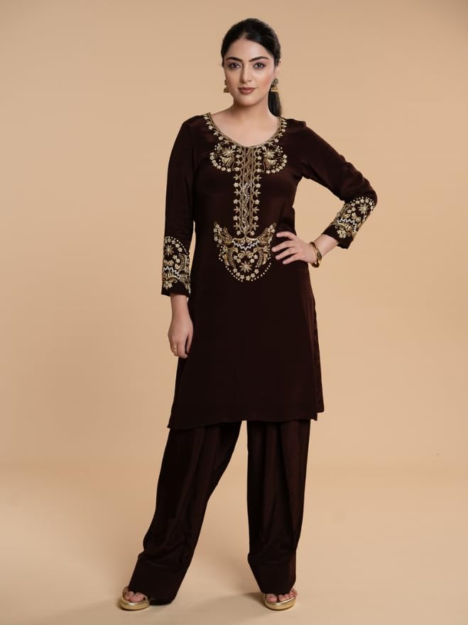 Women's Dark Brown Farshi Salwar suit with Dupatta | Crepe Silk | Mulcotton Dupatta | Golden Hand Embroidery