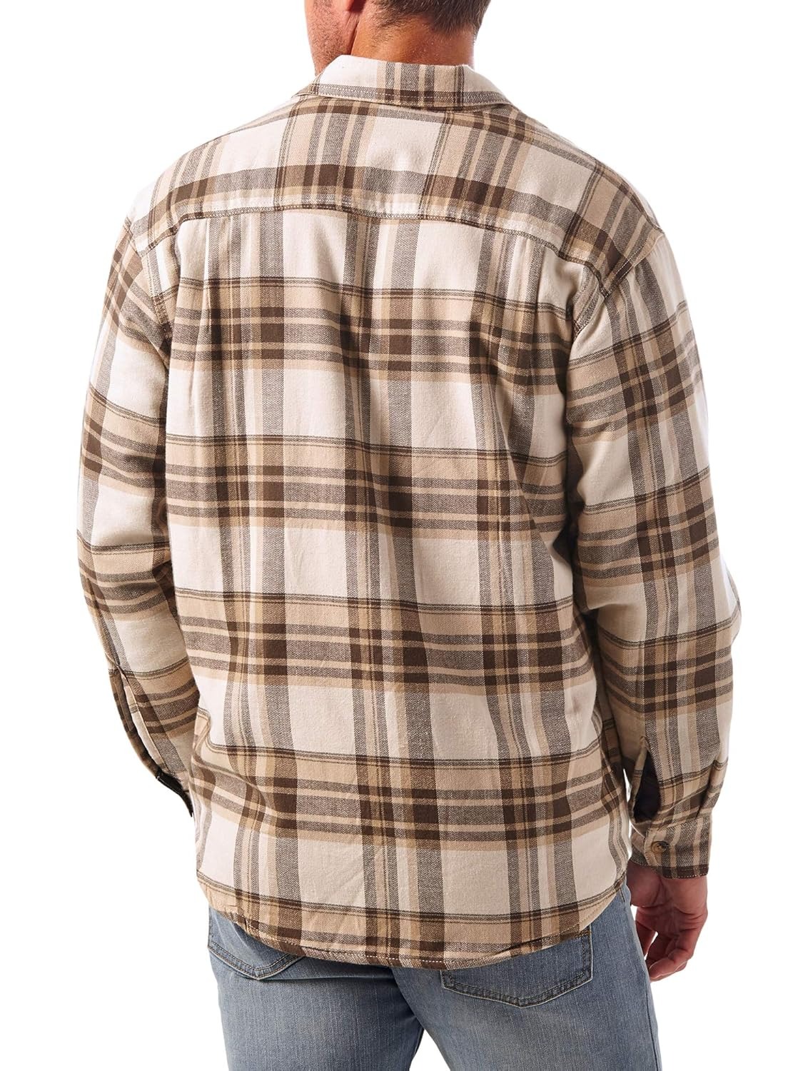 • ALL DAY COMFORT. Crafted with a 100% Cotton flannel shell and 100% Polyester soft tan sherpa lining with diamond black quilted padding in the sleeves, this shirt jacket is guaranteed to provide all day comfort.