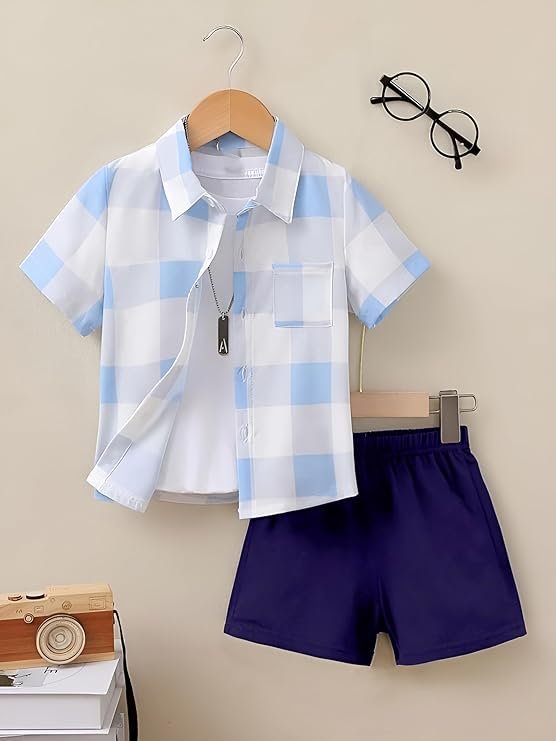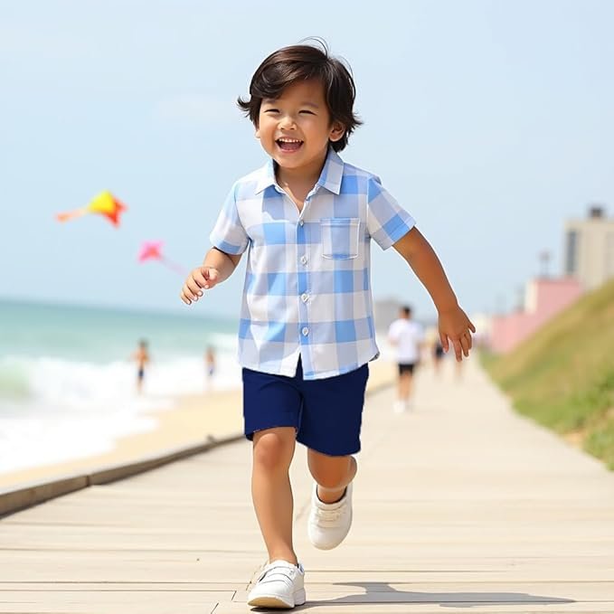 XEAMUSY?s summer outfit features a stylish crown print shirt and navy shorts, giving a fresh and smart look to boys on sunny days or vacations.